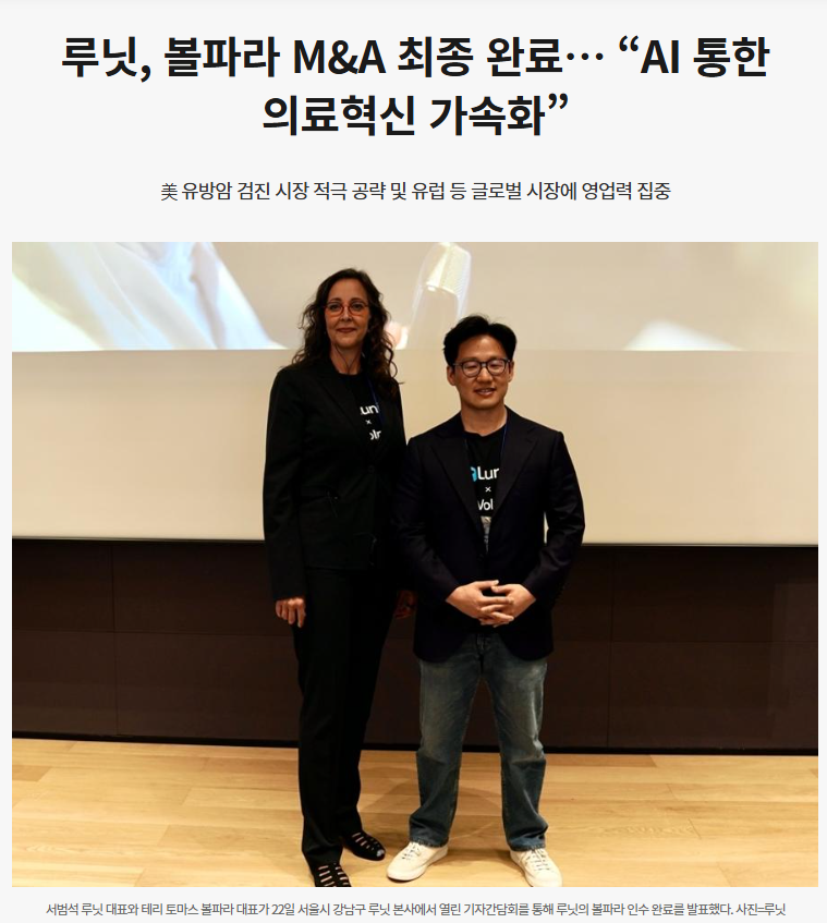 - 미국 유방암진단회사 볼파라 인수 - 루닛은 2024년 5월 21일, 글로벌 유방암 검진 플랫폼 기업인 볼파라 헬스 테크놀로지(Volpara Health Technologies)를 약 2,600억 원(1억 9,307만 달러)에 인수하여 100% 자회사로 편입했습니다.