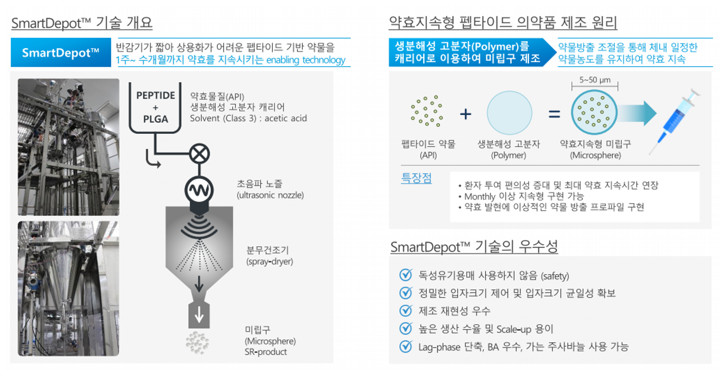 펩트론의 스마트데포(SmartDepot) 기술은 약물을 체내에서 오랫동안 안정적으로 방출하도록 설계된 지속형 약물 전달 시스템으로 기존 기술에 의해 만들어진 주사약물은 빠르게 분해되어 효과가 짧게 지속되지만, 스마트데포 기술은 특수한 미립구(마이크로스피어) 구조를 이용해 약물이 서서히 방출되도록 조절하여 하루 한 번 또는 매주 투여해야 하는 주사제를 한 달 또는 몇 달에 한 번만 투여해도 효과가 지속되도록 할 수있습니다. 기존 GLP-1을 하루 한 번, 일주일에 한 번 투약하던 것을 한 달 제형으로 만들어 한 달에 한 번 투약으로 투약횟수를 줄인다면 환자의 편의성도 증대 될 뿐 아니라 그로 인한 경제적 이익 역시 증대 되어 약가도 절감 할 수 있는 효과를 기대해 볼수 있습니다.